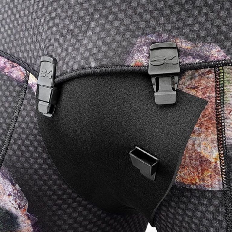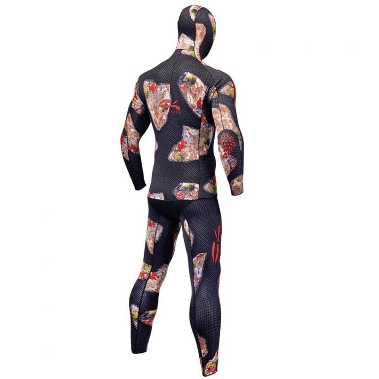 Le design exclusif de cette combinaison comporte un fond de couleur fibre de carbone avec des taches de fond marin camoufle? en 3D. Cette solution casse l’image du plongeur augmentant l’effet camoufle?.